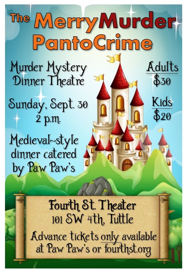 Tickets are now on sale for our annual murder mystery dinner theatre, The MerryMurder PantoCrime! The show is being catered by PawPaw’s Restaurant in Tuttle. Tickets are available on our website, fourthst.org.