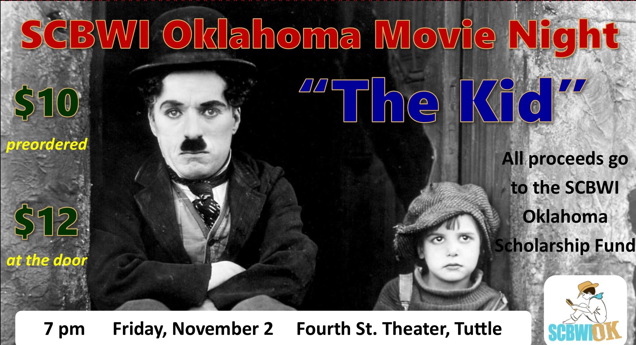 The Society of Children’s Book Writers and Illustrators of Oklahoma will hold a movie fundraiser at Fourth St. Theater in Tuttle on Friday, Nov. 2, at 7 pm. The organization will be showing the Charlie Chaplin silent film, “The Kid,” to help raise money for their scholarship fund.