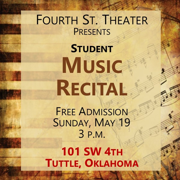 Fourth St. Theater is proud to announce its first-ever music recital! Featuring the students of piano teacher Karlene Gottman, piano teacher Jessica Witt, and guitar teacher Ace Perreault, the recital will be held at 3 p.m. on Sunday, May 19. Admission is free, and refreshments will be served.