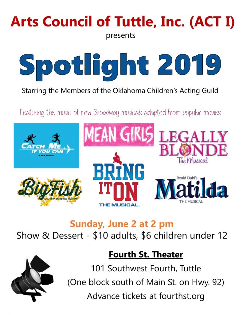 Our first show of the summer, Spotlight 2019, will be held on Sunday, June 2, presented by the Arts Council of Tuttle, Inc. and starring the members of the Oklahoma Children’s Acting Guild.