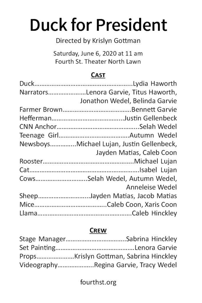 Duck for President, this year’s homeschool production, will be held on Saturday, June 6, at 11 a.m. on the Fourth St. Theater North Lawn. Pop-up tents will be erected to shield audiences from the sun. Chairs will be closer than six feet apart, but feel free to bring your own lawn chairs for social distancing.